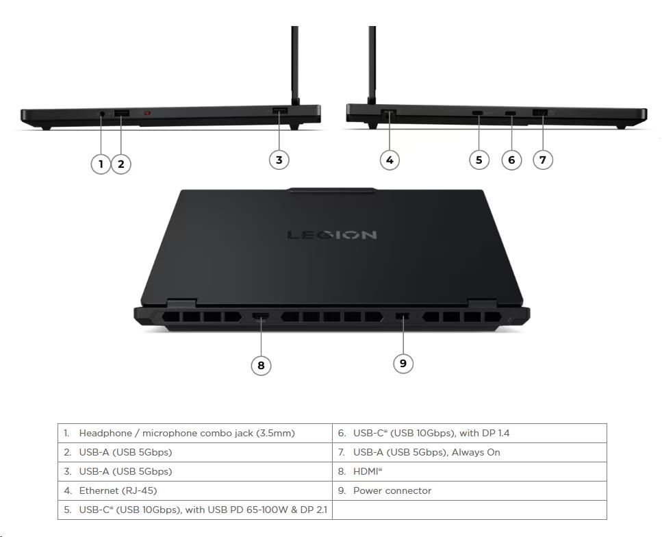 | Standartné porty | 2x USB-A (USB 5Gbps / USB 3.2 Gen 1) 1x USB-A (USB 5Gbps / USB 3.2 Gen 1), Always On 1x USB-C® (USB 10Gbps / USB 3.2 Gen 2), with USB PD 65-100W and DisplayPort™ 2.1 1x USB-C® (USB 10Gbps / USB 3.2 Gen 2), with DisplayPort™ 1.4 1x HDMI® 2.1, up to 8K/60Hz 1x Headphone / microphone combo jack (3.5mm) 1x Ethernet (RJ-45) 1x Power connector |