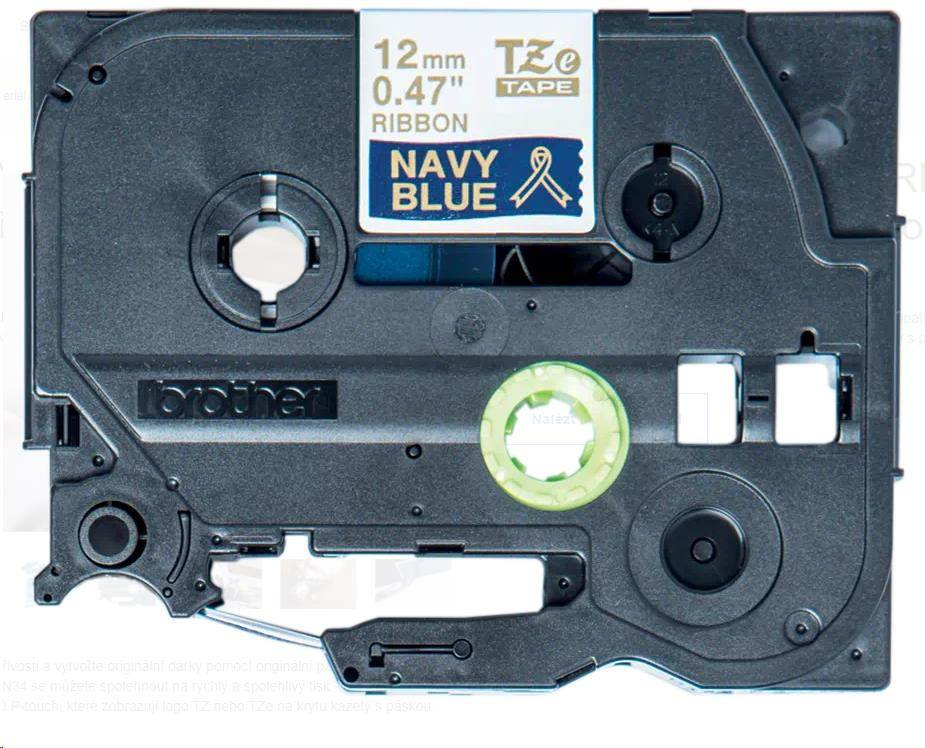 BROTHER TZE-RN34 - 12 mm široká TZ kazeta, TEXTILNÁ páska 4 m - na výrobu darčekov - NEPRIĽAHLÁ - MODRÁ PÁSKA, ZLATÝ POTISK
