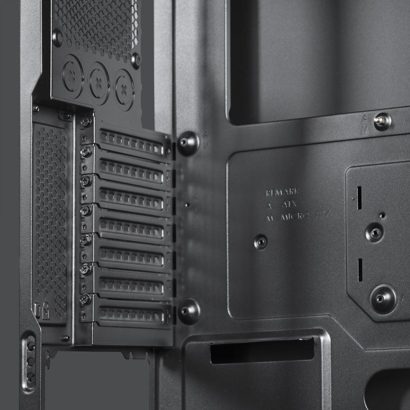 | Kompatibilita chladenia | Horná časť: 2x 120mm/140mm ventilátory alebo až 280mm radiátor (použitie 280mm radiátora blokuje prvý ODD disk) Predná časť: 2x 120mm ventilátory Zadná časť: 1x 120mm ventilátor Spodná časť: 1x 120mm alebo 140mm ventilátor (v závislosti od dĺžky PSU) |