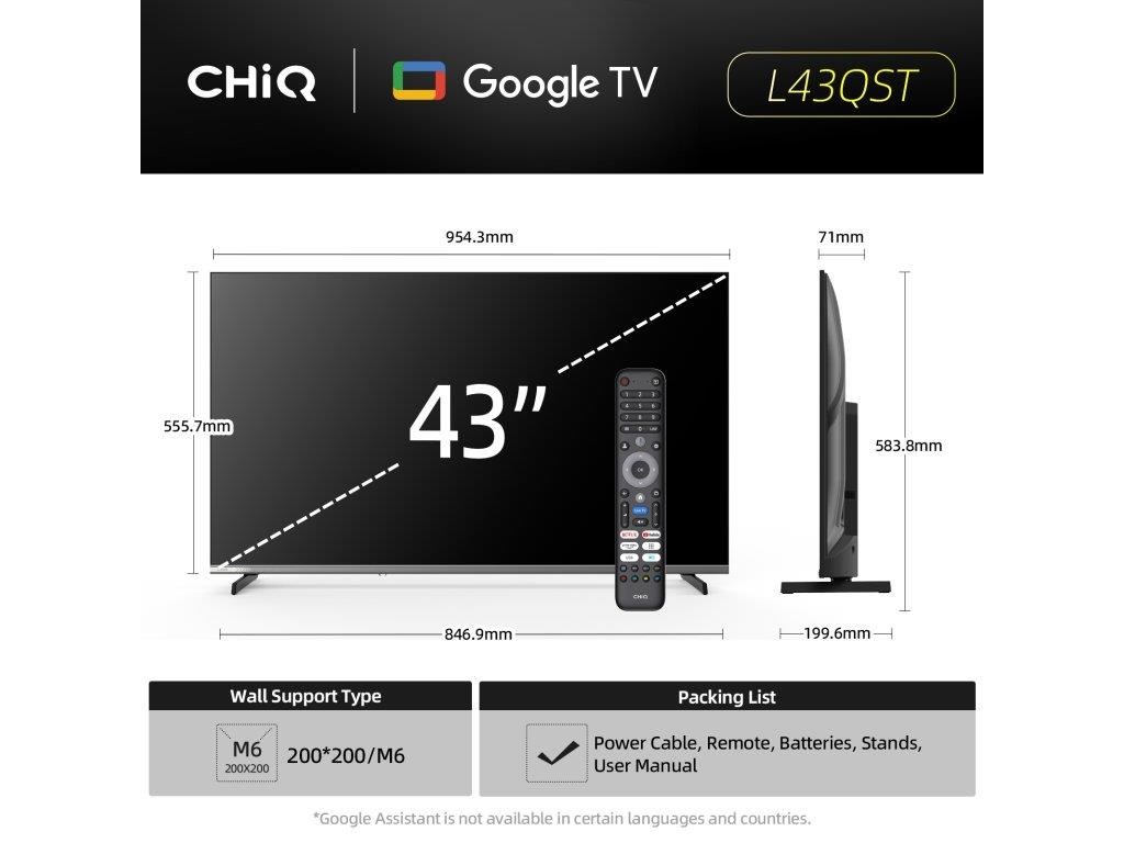 CHiQ 43“ L43QST, ultra tenká bezrámová QLED Smart Android 14 TV s HDR10, HLG, obrazovkou s Full HD s rozlíšením 1920 x 1080 pixelov, priestorovým zvukom Dolby Audio a dbx-tv.