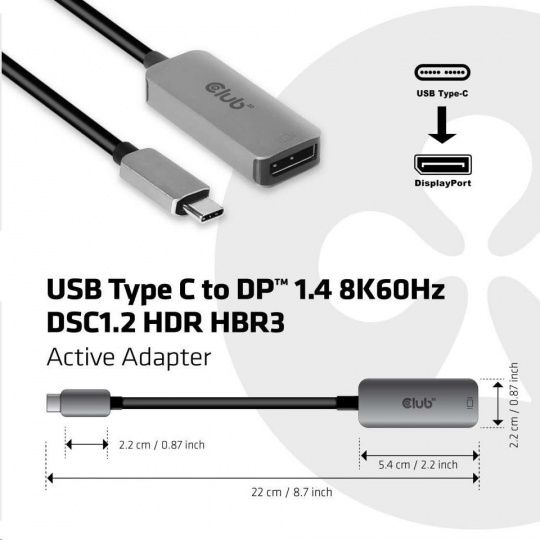 CAC-1567 - Club 3D USB typu C na DisplayPort™ 1.4 Adaptér 8K60Hz za predpokladu, že zdroj podporuje DSC1.2 HBR3 umožňuje pripojiť akýkoľvek zdroj USB typu C k displeju DisplayPort™ s maximálnym rozlíšením 8K60 Hz a podporou HDR.