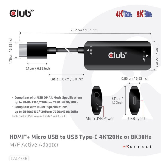 | In the box | - CAC-1336 HDMI™+ Micro USB to USB Type-C 4K120Hz or 8K30Hz M/F Active Adapter - USB Type-A to Micro USB M/M 1m / 3.28 ft cable for powering the adapter |