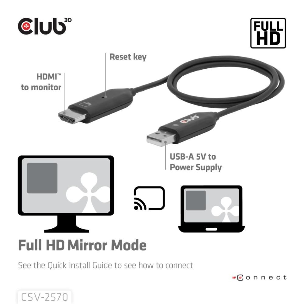 Club 3D CSV-2570 je prvé bezdrôtové zariadenie s technológiou HDMI. Pomocou vysielača a prijímača bezdrátovo prenáša video a zvuk vo FullHD kvalite z zariadenia s USB-C na HDMI displeje.