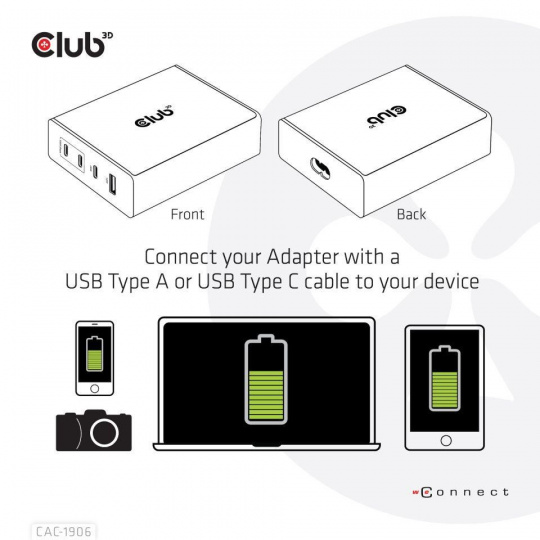 Cestovná nabíjačka Club 3D CAC-1906 132W technológia GAN, štyri porty USB typu A a C, Power Delivery(PD) 3.0 Podpora. Tento produkt je vysoko výkonná cestovná nabíjačka s nízkou hmotnosťou a maximálnym výstupným výkonom 132 W. Vďaka 3 portom USB typu C a 1 portu typu A podporuje celkový výkon až 132 W, čo dokáže uspokojiť potreby nabíjania štyroch zariadení súčasne. Kompatibilita s viacerými zariadeniami (podpora mobilných telefónov, tabletov a notebookov). Je to praktický spoločník na cestách a pri práci! Kompaktné rozmery a vynikajúci výkon: Vďaka technológii GAN je táto nabíjačka o 50 % menšia ako 132W nabíjačka MacBook, dostatočne malá na to, aby ste ju mohli nosiť kamkoľvek so sebou.132W nástenná nabíjačka je vhodná pre rôzne zariadenia PD od smartfónov až po notebooky, pričom nabíjanie je jednoduché pre všetkých. Nabíjačka Power Charger je ľahká bez kompromisov v oblasti kvality a bezpečnosti. Vďaka technológii nabíjania Power Delivery(PD) vám táto univerzálna nabíjačka poskytuje funkciu nabíjania cez rozhranie USB typu C, môžete nabíjať akýkoľvek pripojený mobilný telefón/tablet/notebook.