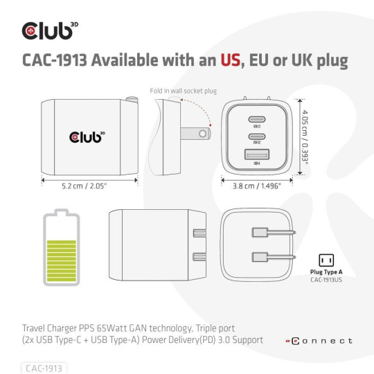 The Club3D CAC-1913 Travel Charger PPS 65Watt GAN technology, Triple port(2x USB Type-C + USB Type-A) Power Delivery(PD) 3.0 Support. GAN technology chipset makes this charger 50% smaller than a 65Watt traditional charger, small enough to carry anywhere.The Programmable Power Supply(PPS) 65Watt wall charger match a variety of PD devices from smart phones to laptops, one for all making charging simple. This wide compatibility charger will be your convenient companion during your business trip or vacation.
