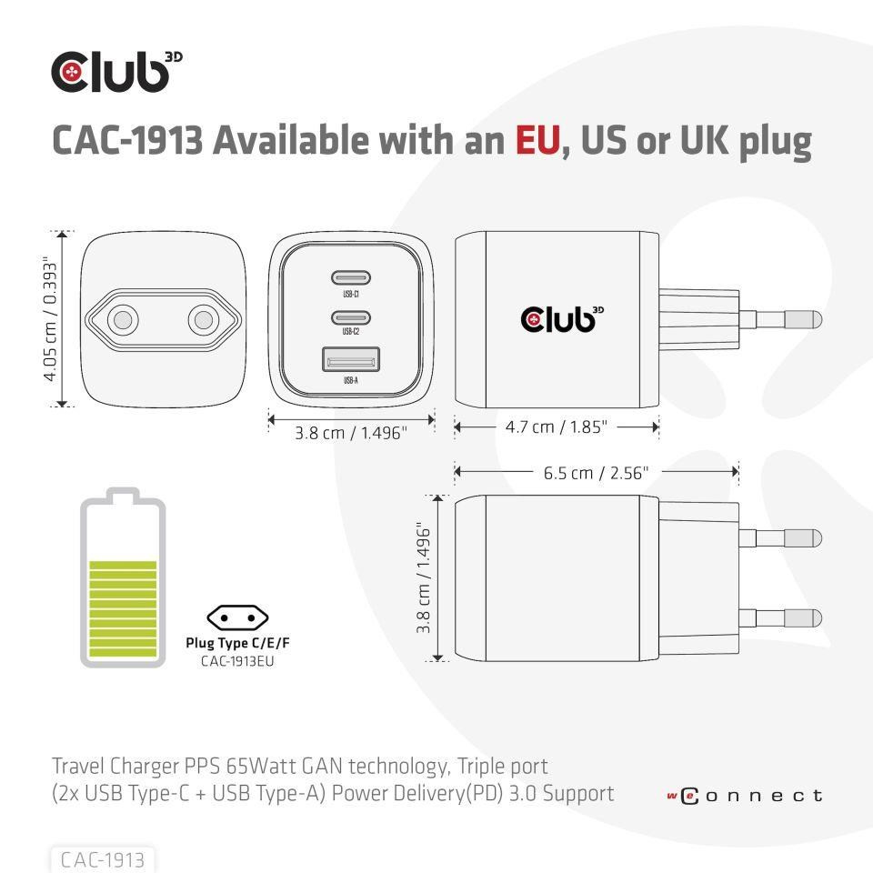 The Club3D CAC-1913 Travel Charger PPS 65Watt GAN technology, Triple port(2x USB Type-C + USB Type-A) Power Delivery(PD) 3.0 Support. GAN technology chipset makes this charger 50% smaller than a 65Watt traditional charger, small enough to carry anywhere.The Programmable Power Supply(PPS) 65Watt wall charger match a variety of PD devices from smart phones to laptops, one for all making charging simple. This wide compatibility charger will be your convenient companion during your business trip or vacation.