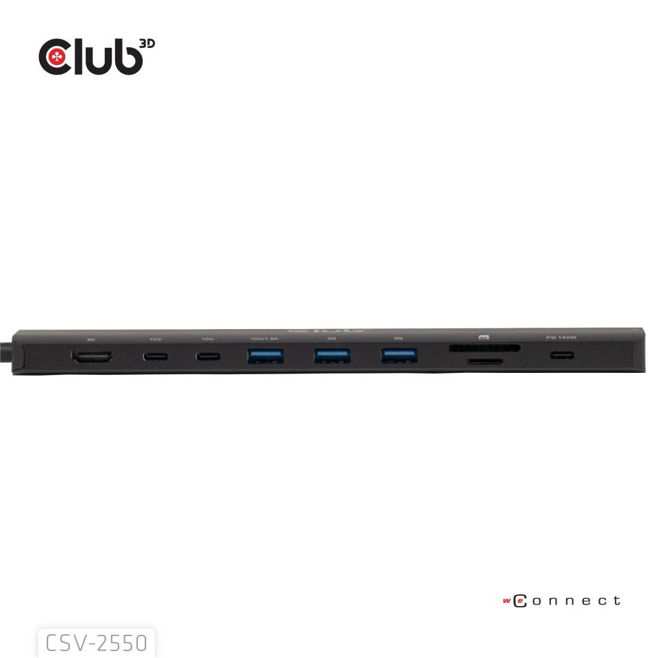 Club 3D CSV-2550 je prenosná dokovacia stanica 10-1 USB-C 10Gbps na HDMI 8K30Hz PD3.1 Max.140Watt, ktorá predstavuje ideálne riešenie pre rozšírenie portu USB-C alebo Thunderbolt hostiteľa (PC/Laptop/Mobilný telefón atď.), najmä pre hostiteľov s jediným portom USB-C. Tento rozbočovač umožňuje výstup HDMI s max. 8K30Hz alebo 4K144Hz vysokou obnovovacou frekvenciou pre prirodzenejší a plynulejší vizuálny zážitok pri súčasnom prenose dát USB 10Gbps. Dátové porty 3x USB-A a 2x USB-C umožňujú pripojiť 5 zariadení USB súčasne. SD/Micro SD umožňujú vložiť 2 sloty pre karty súčasne pre prenos dát alebo pre čítanie/zápis informácií na hostiteľskom počítači. Port RJ45 umožňuje hostiteľovi získať prístup k 2,5Gigabitovému Ethernetu. Okrem toho podporuje USB-C samica PD 3.1 s maximálnym 140W PD nabíjaním. Môže fungovať na všetkých hostiteľských zariadeniach USB-C s podporou režimu DP Alt.