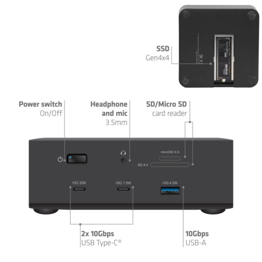 CSV-2562 je certifikovaná dockovacia stanica Thunderbolt 5, ktorá združuje všetky nevyhnutné porty do jedného zariadenia, vrátane slotu pre SSD umožňujúceho jednoduché rozšírenie úložiska počítača s rýchlosťou prenosu dát zodpovedajúcou internému disku.