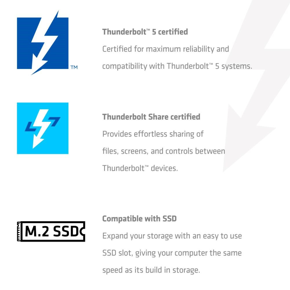 CERTIFIKOVANÝ THUNDERBOLT 5 – Náš najvyšší model zariadenia TB5, plne certifikovaný pre zaistenie kompatibility a výkonnosti.