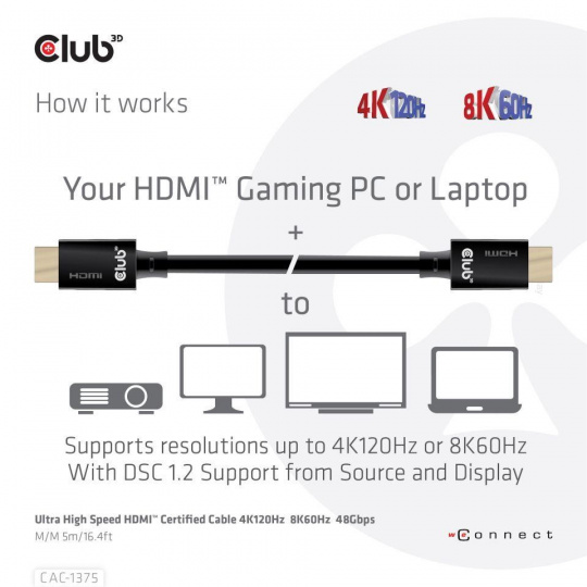 Club 3D CAC-1375 Ultra High Speed HDMI™2.1 Certifikovaný kábel je skonštruovaný tak, aby zvládol najvyššiu kvalitu video- a audio- signálov.