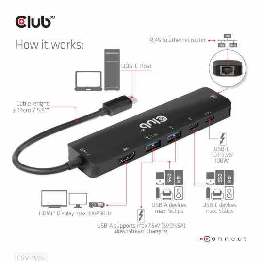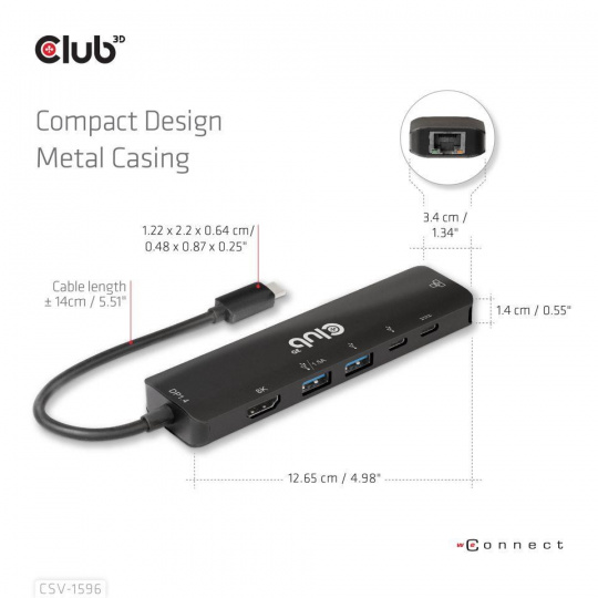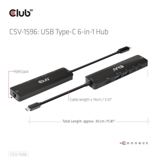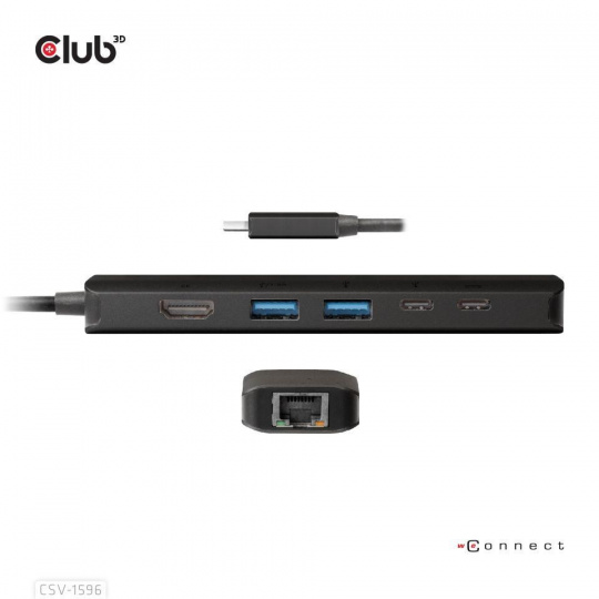 Club 3D CSV-1596 je USB Gen1 Type-C, rozbočovač 6 v 1 s HDMI™8K30Hz, 2xUSB Type-A, RJ45 a 2xUSB Type-C, dátové a PD nabíjanie 100 W, ktorý poskytuje ideálne riešenie na rozšírenie portu hostiteľa Type-C/Thunderbolt (PC/Laptop/Mobilný telefón atď.), najmä pre hostiteľov s jedným portom typu C. Tento rozbočovač využíva najnovšiu technológiu DP1.iC podporuje režim 4 Alt, ktorý umožňuje výstup videa HDMI™ s max. 8K30Hz a medzitým prenášať USB 3.1 dáta s maximálnou rýchlosťou 5 Gb/s. Dátové porty USB typu A a typu C umožňujú súčasné pripojenie 4 zariadení USB. 1 Gigabit Ethernet pre super rýchly Ethernet. Okrem toho samica typu C podporuje PD 3.0 PD Nabíjanie 100 W (15 W je vyhradených na fungovanie tohto produktu, zvyšok energie (max. 85 W) sa odovzdá na nabíjanie pre hostiteľa. Tento rozbočovač 6 v 1 bude fungovať na všetkých hostiteľských zariadeniach typu C s podporou režimu DP Alt.