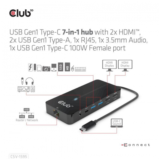 The Club 3D CSV-1595 USB Gen1 Type-C 7-in-1 hub with with 2x HDMI™, 2x USB Gen1 Type-A, 1x RJ45, 1x 3.5mm Audio, 1x USB Gen1 Type-C 100W Female port, provides a very advanced, efficient solution to extend a single USB Gen1 Type-C port to multiple ports. It integrates video, data and power ports that allows to connect 2 displays simultaneously for enjoying videos on a larger screen, connect multiple USB Gen1 devices for data transmission up to 5Gbps, connect a Gigabit Ethernet source for getting your PC connected to super high speed network, or connect to headset to enjoy fantastic music. It also provides PD charging for support up to max. 100W PD charging. This is for operating this device and charge the host simultaneously. It can work on all DP™1.4 Alt mode supported USB Gen1 Type-C hosts.