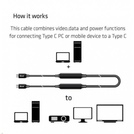Club 3D CAC-1535 je obojsmerný aktívny kábel z USB typu C na USB typu C s čipovou sadou Re-timer na zlepšenie videa, dát a napájania, ktorý dosahuje dĺžku až 5 metrov/16.40ft . Pre video je kompatibilný s DP1.4 štandardov s teoretickým rozlíšením až 8K@60Hz. Pre dáta je kompatibilný s USB3.2 Gen 2 s maximálnou rýchlosťou prenosu dát 10 Gb/s a v prípade napájania je schopný dodať maximálne 60 W (20 V/3 A) PD Charging.