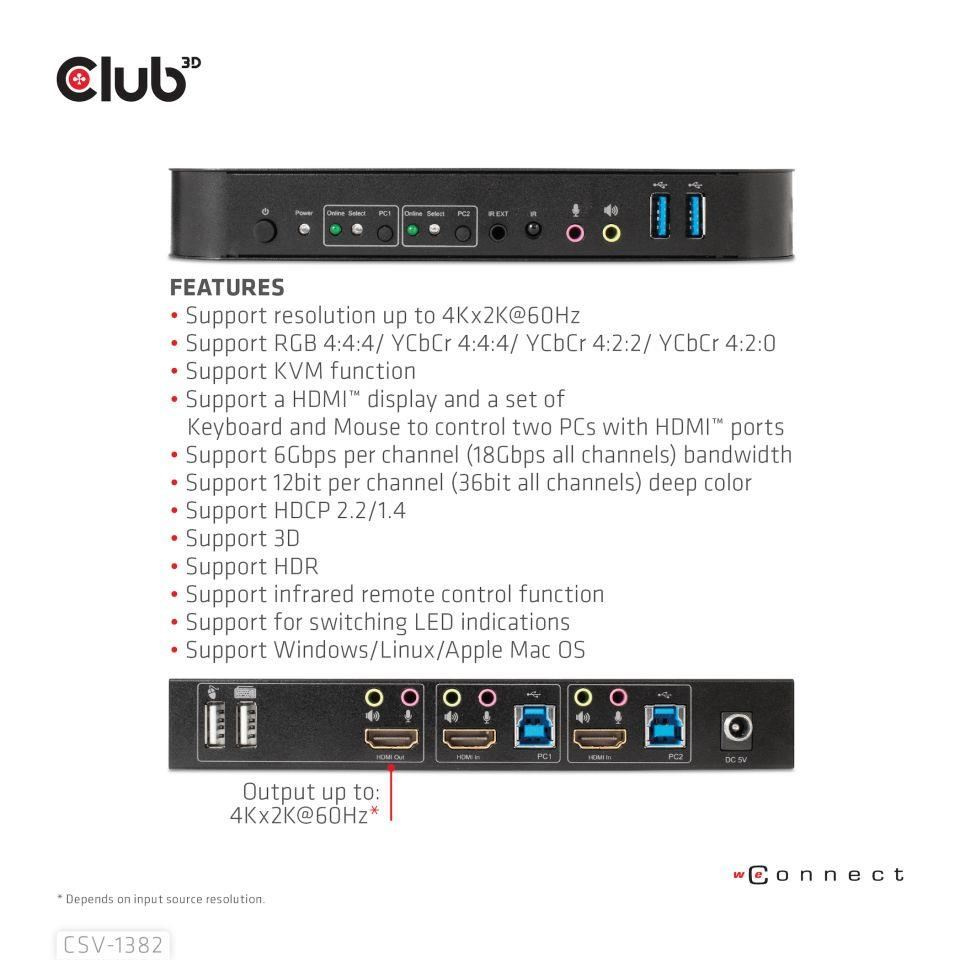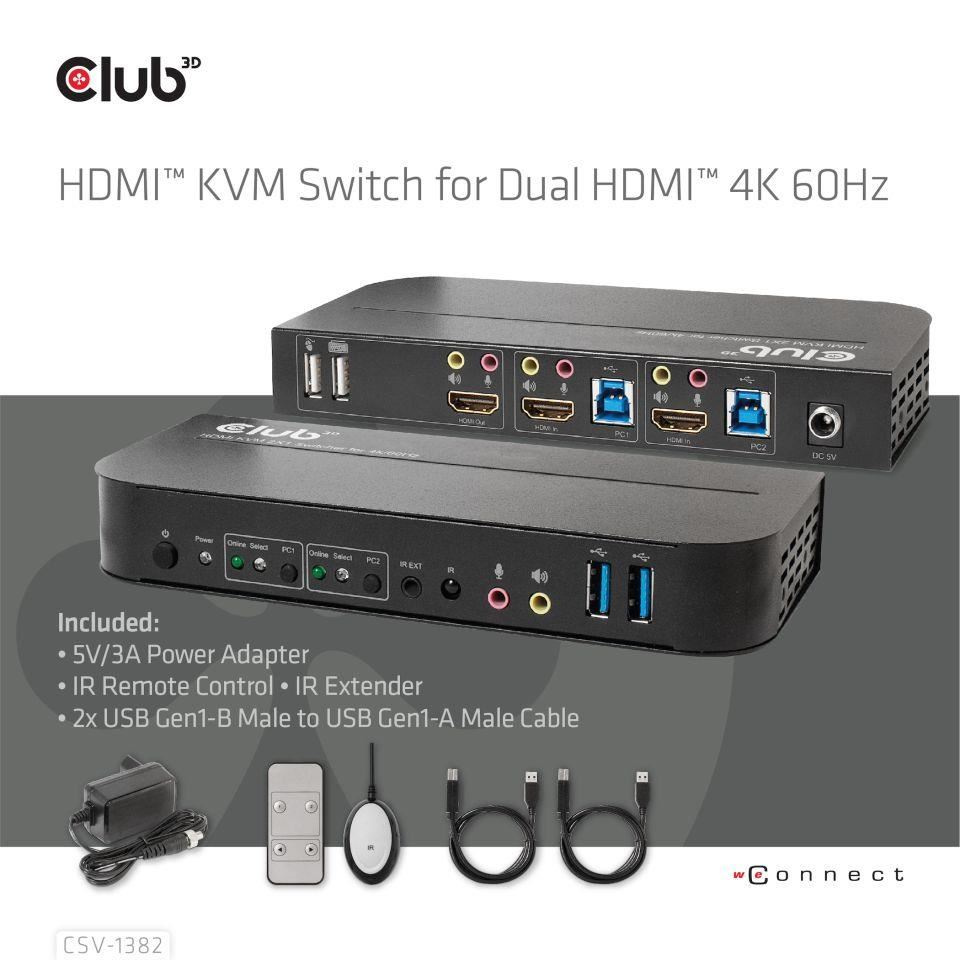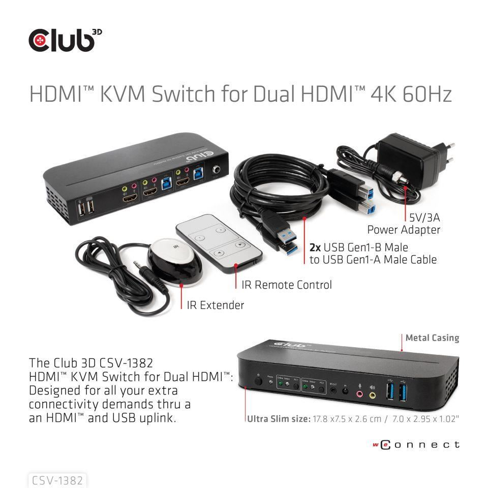 Sieťový prepínač Club3D - Prepínač, HDMI KVM prepínač - Dual HDMI 4K 60Hz