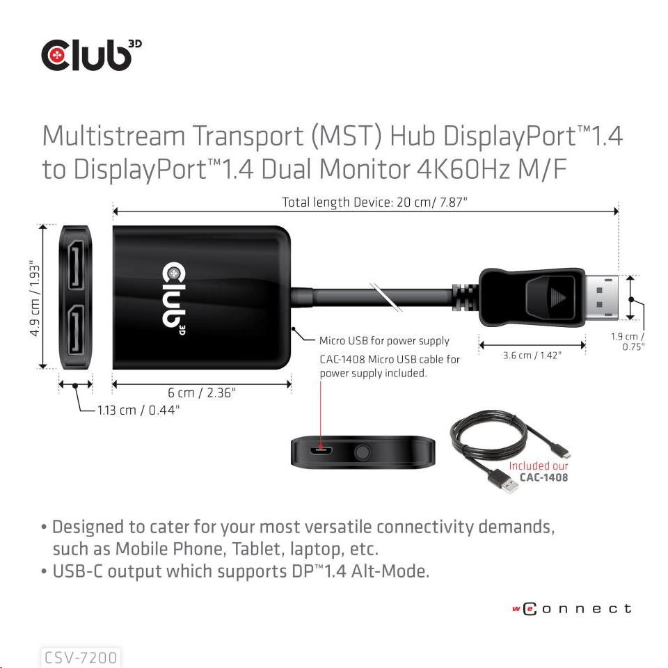 Videoadaptér Club3D MST (Multi Stream Transport) DisplayPort 1.4 na DisplayPort 1.4 Duálny monitor 4K60Hz (M/F), čierny