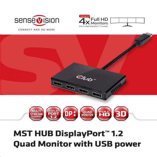 Rozbočovače Club 3D SenseVision MST využívajú technológiu Multi Stream Transport, jedinečnú funkciu DisplayPort ™ 1.2, ktorá umožňuje prenášať viac nezávislých nekomprimovaných video (a audio) tokov na jedinom kábli To umožňuje použitie viacerých monitorov pripojených pomocou rozbočovača MST. Rozbočovače Club3D MST sú schopné distribuovať tieto video toky na pripojené obrazovky.