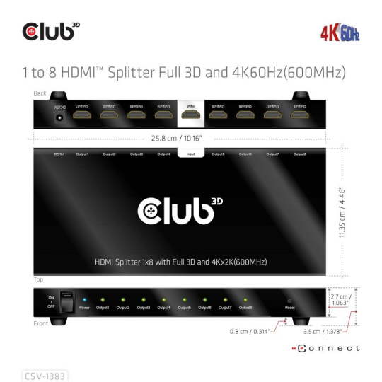 Club 3D CSV-1383 je vysoko výkonný a malý 1 až 8 HDMI™ Ultra High Definition Splitter s hot plug a železným puzdrom. Distribuuje vstup signálu HDMI™ do ôsmich identických výstupov súčasne. Poskytuje vysoko výkonný audio a video výstup prostredníctvom káblov HDMI™ až do rozlíšenia 4K@60Hz a je schopný prijímať a prenášať šírku pásma až 6Gbps/600MHz.