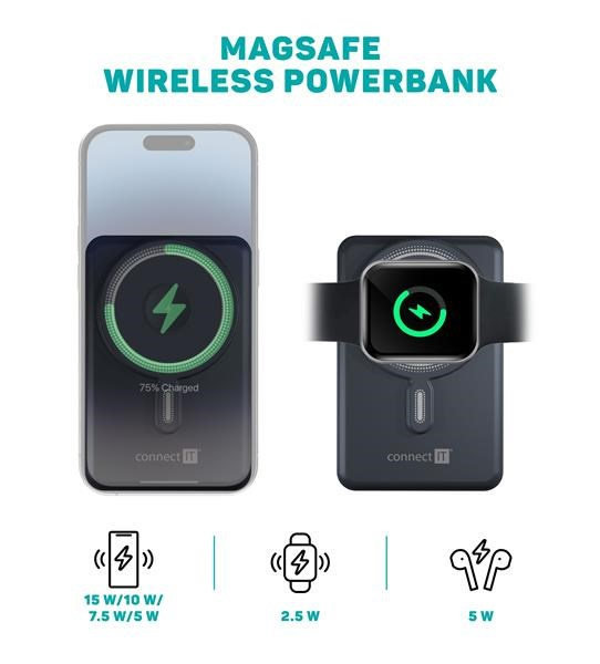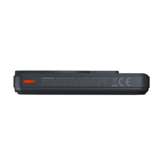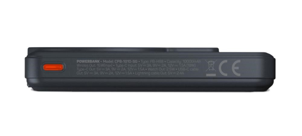 Bezdrôtová MagSafe powerbanka s kapacitou 10000 mAh kompatibilná s Apple iPhone a Apple Watch. Disponuje integrovaným USB-C a Lightning káblom. Podporuje až 20 W rýchlonabíjanie pomocou USB-C kábla.
