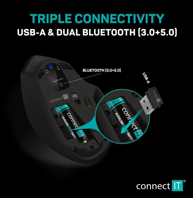 CONNECT IT Trojitá bezdrôtová myš SmartSwitch, 2.4 GHz a Bluetooth 5.0, čierna