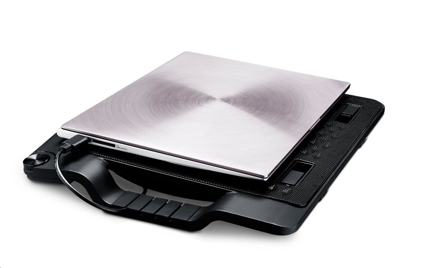 ERGOSTAND III je ergonomický chladiaci stojan na notebook, vďaka ktorému bude používanie notebooku zábavné a zvýši sa vaša produktivita pri práci. Veľký 230 mm ultra tichý ventilátor s úplne novým Loop Dynamic Bearing a exkluzívnym dizajnom lopatiek ventilátora poskytuje lepší rozptyl vzduchu, veľmi nízku hlučnosť a dlhšiu životnosť, čím zvyšuje výkon notebooku. Odnímateľná predná doska umožňuje rýchle čistenie na udržanie vysokého výkonu. 6 ergonomických nastavení výšky vám umožní rýchlo si vybrať ideálny uhol na zmiernenie bolesti krku a ramien. Drážky a háčiky udržujú káble čisté a upratané, zatiaľ čo rozbočovač USB rozširuje jeden port notebooku na štyri (4). Kompatibilný so 17" notebookmi a tabletmi vďaka nastaviteľným protišmykovým držiakom.