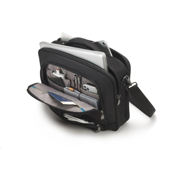 Hrajte bezpečne s Eco Multi PRO! Taška v tvare ustrice vás spoľahlivo sprevádzať všade a spĺňa najvyššie štandardy kvality, funkčnosti a ochrany. Systém Fitall s integrovaným popruhom na uchopenie a vypolstrovanými oddelenými priestorom upevní váš 11-14,1" notebook a bezpečne ho dopraví na miesto určenia. Uzamykateľná kapsa na notebook, vypolstrovanie z peny s vysokou hustotou (HDF) a rám vypolstrovaný kovom zabezpečujú všestrannú ochranu. Vypolstrovaná priehradka na tablet do veľkosti 12,9" chráni pred nárazmi a je vo vnútri vybavená extra mäkkým Nylexom. Veľkorysý úložný priestor pre vaše dokumenty a mobilné príslušenstvo. Dve ďalšie priehradky na dokumenty v zadnej časti. Predná kapsa s kľúčenkou a vkladacími kapsami umožňuje usporiadať osobné vybavenie. Dlhodobé pohodlie pri nosení vďaka pohodlným a nýtovaným rúčkam, nastaviteľnému vypolstrovanému ramienkovému popruhu a praktickému popruhu na upevnenie na vozík. Kufrík Eco Multi PRO je teda ideálny pre vás, ak ste stále na cestách a chcete podporiť recykláciu PET fliaš ekologickým kufríkom.