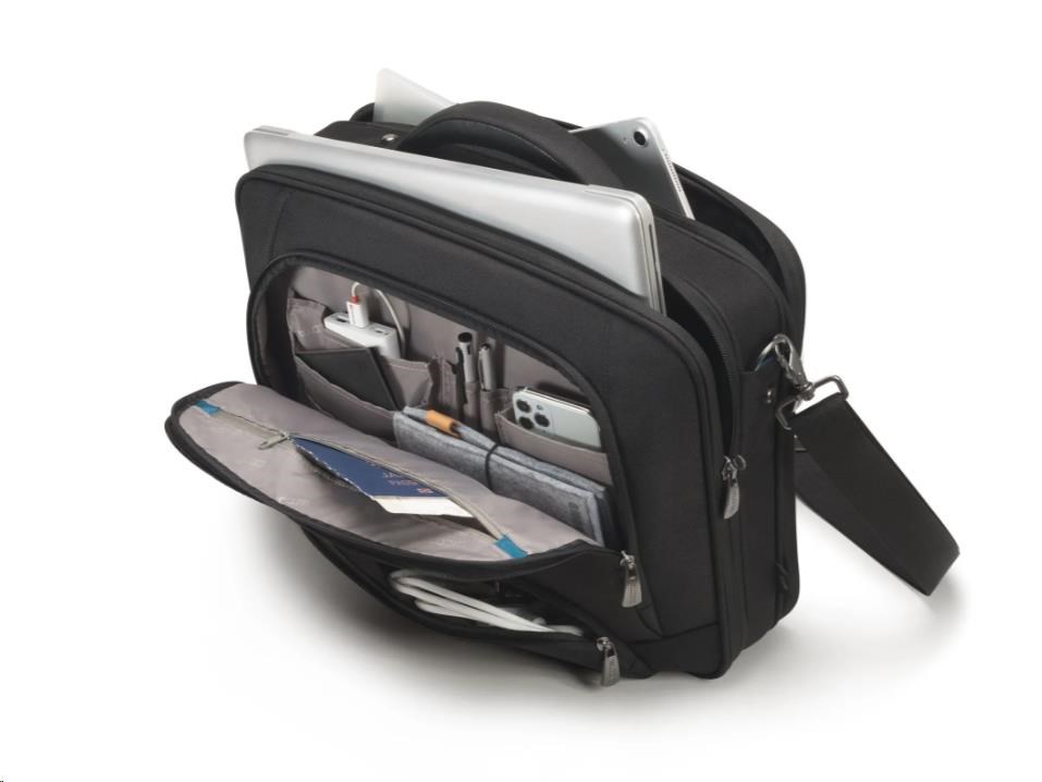 Hrajte bezpečne s Eco Multi PRO! Taška v tvare ustrice vás spoľahlivo sprevádzať všade a spĺňa najvyššie štandardy kvality, funkčnosti a ochrany. Systém Fitall s integrovaným popruhom na uchopenie a vypolstrovanými oddelenými priestorom upevní váš 11-14,1" notebook a bezpečne ho dopraví na miesto určenia. Uzamykateľná kapsa na notebook, vypolstrovanie z peny s vysokou hustotou (HDF) a rám vypolstrovaný kovom zabezpečujú všestrannú ochranu. Vypolstrovaná priehradka na tablet do veľkosti 12,9" chráni pred nárazmi a je vo vnútri vybavená extra mäkkým Nylexom. Veľkorysý úložný priestor pre vaše dokumenty a mobilné príslušenstvo. Dve ďalšie priehradky na dokumenty v zadnej časti. Predná kapsa s kľúčenkou a vkladacími kapsami umožňuje usporiadať osobné vybavenie. Dlhodobé pohodlie pri nosení vďaka pohodlným a nýtovaným rúčkam, nastaviteľnému vypolstrovanému ramienkovému popruhu a praktickému popruhu na upevnenie na vozík. Kufrík Eco Multi PRO je teda ideálny pre vás, ak ste stále na cestách a chcete podporiť recykláciu PET fliaš ekologickým kufríkom.