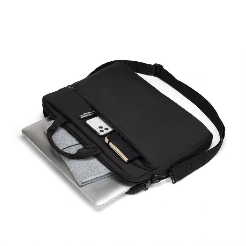 Upevňovací pásik zabezpečuje bezpečné uchytenie bez vyklzu. Dokumenty a mobilné príslušenstvo, ako sú chytré telefóny, vizitky, pera atď., sú vždy po ruke v prednej priehradke na zips. Pohodlné nosenie zabezpečuje dĺžkovo nastaviteľný a odnímateľný ramenný popruh a rukoväť. DICOTA zdôrazňuje odolnosť rodiny ONE predĺženou päťročnou zárukou.