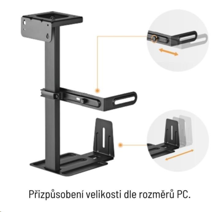 Jednou z hlavných predností tohto držiaku je jeho nastaviteľnosť, ktorá umožňuje voľne upravovať šírku a dĺžku, aby sa prispôsobil rôznym veľkostiam počítačových skriniek. Držiak je vybavený otočným mechanizmom s rozsahom 360°, čo umožňuje jednoduchý prístup k zadným portom a káblom. Vďaka možnosti montáže pod stôl alebo na stenu je držiak CPB-25 flexibilný a praktický doplnok pre akékoľvek pracovisko.