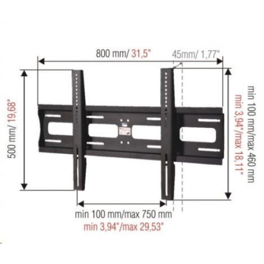 Technické údaje: nosnosť 80kg VESA štandard 100x100 - 720x460 odporúčame na televízory 37" až 60" vzdialenosť TV od steny 45mm vyrobené z kvalitnej silnostennej ocele jednoduchá inštalácia profesionálna kvalita certifikovaný držiak TV farebné prevedenie čierne alebo strieborné záruka 10 rokov DRŽIAK PODPORUJE VESA ŠTANDARDY: VESA 100x100 VESA 200x100 VESA 200x200 VESA 300x200 VESA 300x300 VESA 400x200 VESA 400x300 VESA 400x400 VESA 600x400 všetky atypické rozmery VESA štandardov až do rozmerov 700x460mm