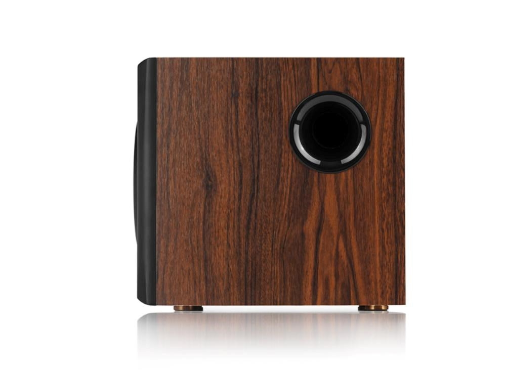Vysokokvalitný drevený vinyl vytvára skvelý zvuk a vzhľad. Preglejka MDF minimalizuje rezonanciu skrinky a poskytuje krištáľovo čistý zvuk. Je vybavený 4" stredotónovými reproduktormi, výškovými reproduktormi s planárnou membránou triedy Hi-Fi a 8" subwooferom pre silný, dunivý zvuk.