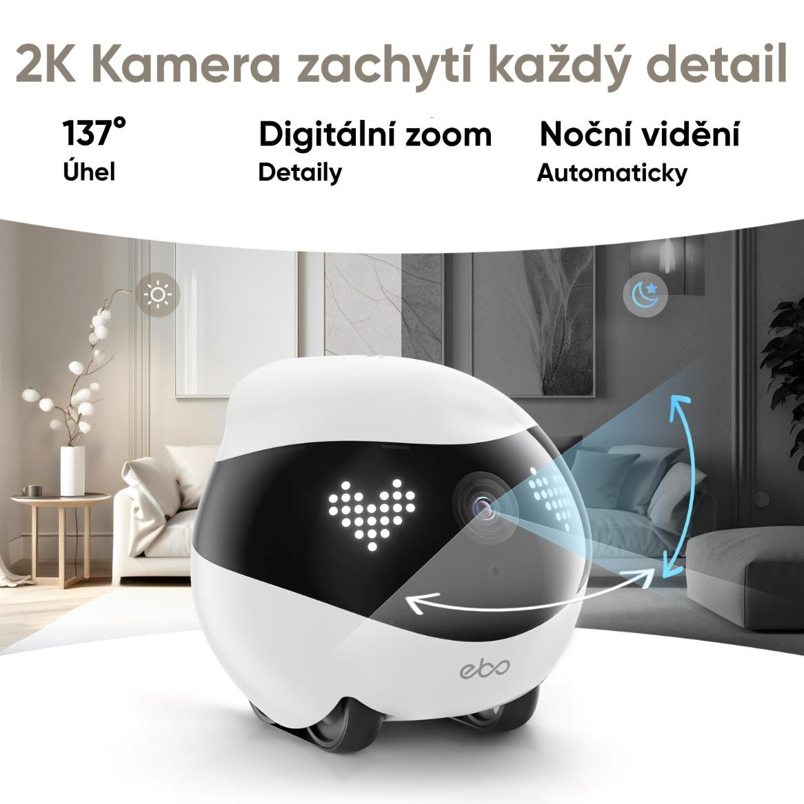 - Mobilný dohľad v reálnom čase – EBO Air 2 sa voľne pohybuje po dome na gumových pások a umožňuje sledovať dianie odkiaľkoľvek cez mobilnú aplikáciu. Robot dokáže zasielať notifikácie o zvláštnych udalostiach.