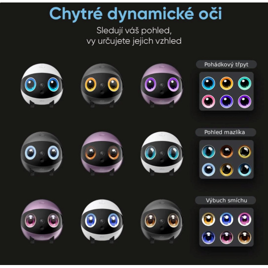 - Chytré dynamické oči – dva displeje s nastaviteľnými farbami a animáciami dodávajú robotovi osobnosť a priateľský vzhľad