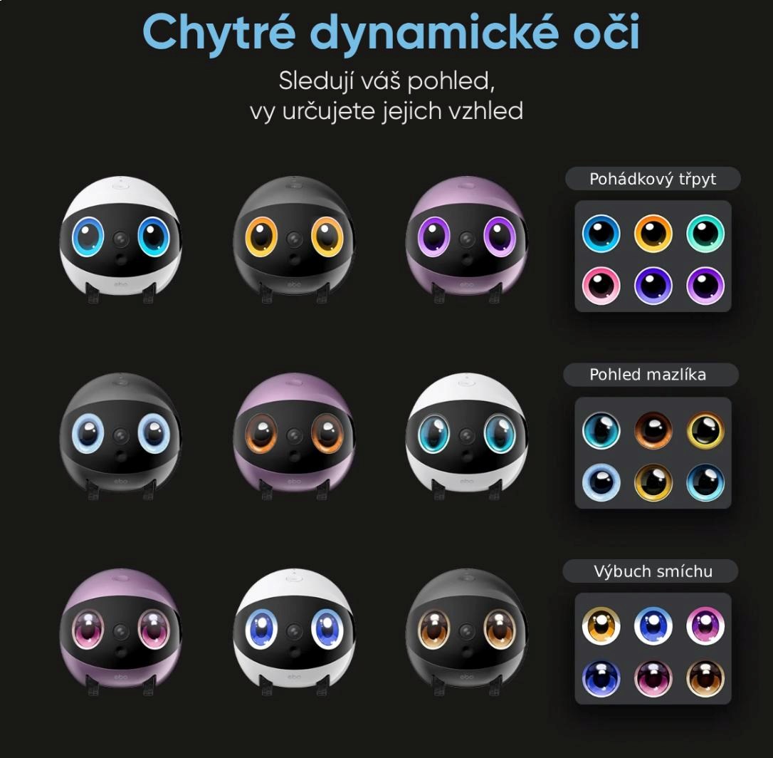 Dva digitálne displeje nahrazujúce oči dodávajú EBO Air 2 Plus osobnosť a emócie. Používatelia si môžu nastaviť farbu, štýl aj animácie, čím prispôsobia vzhľad robota svojej nálade alebo prostrediu. Oči reagujú na rôzne situácie – napríklad pri hovore, nabíjaní alebo pohybe – a vytvárajú živý, priateľský dojem. Vďaka tomu pôsobí EBO Air 2 Plus nielen ako inteligentný prístroj, ale aj ako skutočný člen domácnosti.