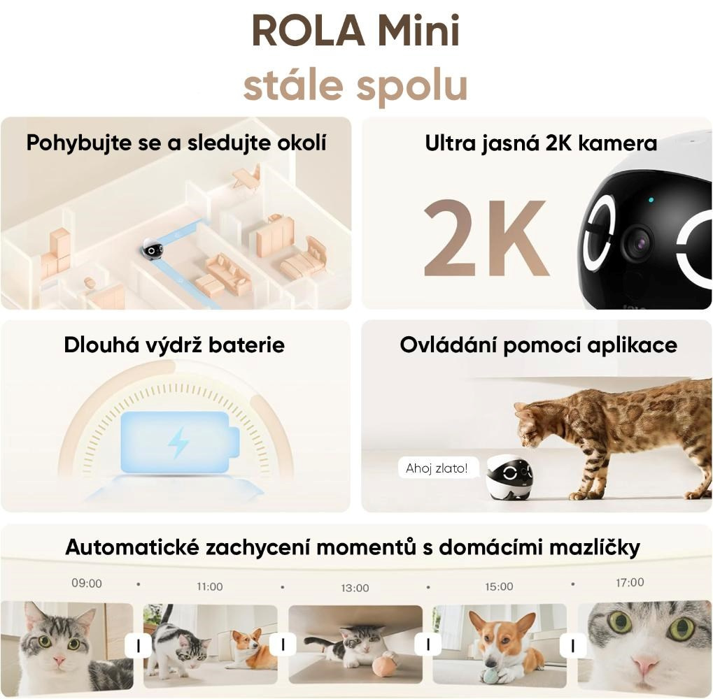 ROLA Mini nie je len kamera, ale interaktívny kamarát, ktorý pomáha zvieratám prekonať samotu a nudu, keď ste preč. Pohyb, zvuk i možnosť reagovať na váš hlas stimulujú prirodzenú zvedavosť a aktivitu zvieraťa. Robot dokáže miláčika baviť, upokojiť aj zaujať, čím prispieva k jeho duševnej pohode a lepšiemu správaniu počas vašej neprítomnosti.