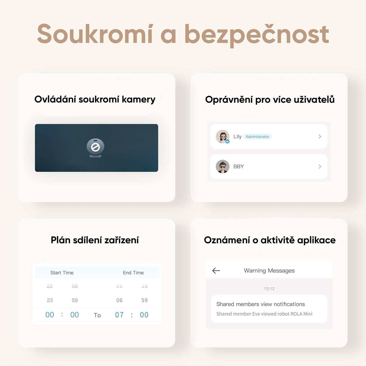 - Diaľkové videohovory – umožňujú volať medzi používateľmi robota a aplikácie, ideálne na kontakt s rodinou.