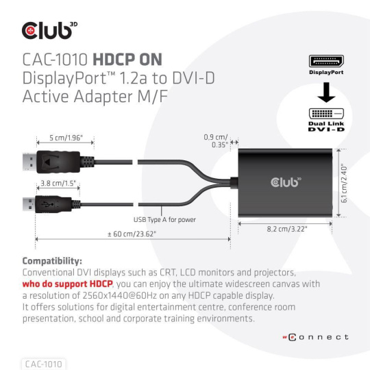 Club3D Aktívny adaptér DisplayPort na Dual Link DVI-D, napájanie USB, 60 cm, HDCP ON