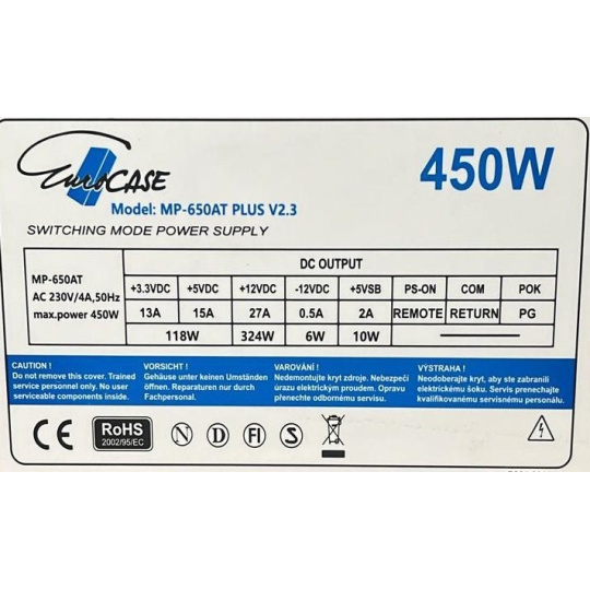 Napájací zdroj ATX značky Eurocase s výkonom 450W. Je osadený 120mm ventilátorom a pasívnym PFC (Power factor correction). Otáčky ventilátora sú riadené termoreguláciou. Zdroj spĺňa požiadavky na elektrickú bezpečnosť a elektromagnetickú kompatibilitu. Zdroj vyhovuje aj smernici 2005/32/EU = príkon v pohotovostnom režime.