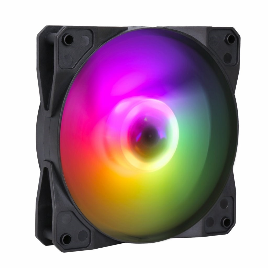ARGB LED ventilátor typu rainbow s LED diodami. Ventilátor umožňuje naraz zobraziť všetkých sedem farieb dúhového spektra. Ide o kontrolný ventilátor, ktorý je určený na použitie s ventilátorom EVOLVEO 12FS. LED osvetlenie je riadené pomocou tlačidla reset alebo LED tlačidla na ovládacom paneli skrine alebo pripojením priloženého ARGB kábla k základnej doske.