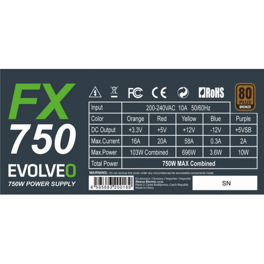 EVOLVEO FX 750 , zdroj 750W ATX, 14cm, tichý, 80+ bronze, bulk, záruka 3 roky