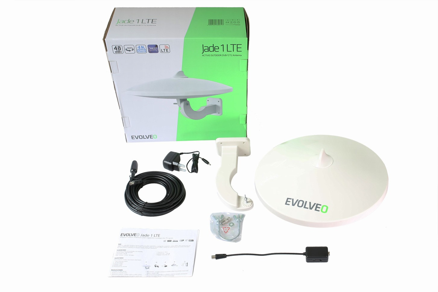 EVOLVEO Jade 1, aktivní venkovní anténa FM/DAB+/DVB-T2, filtr LTE,4G,5G