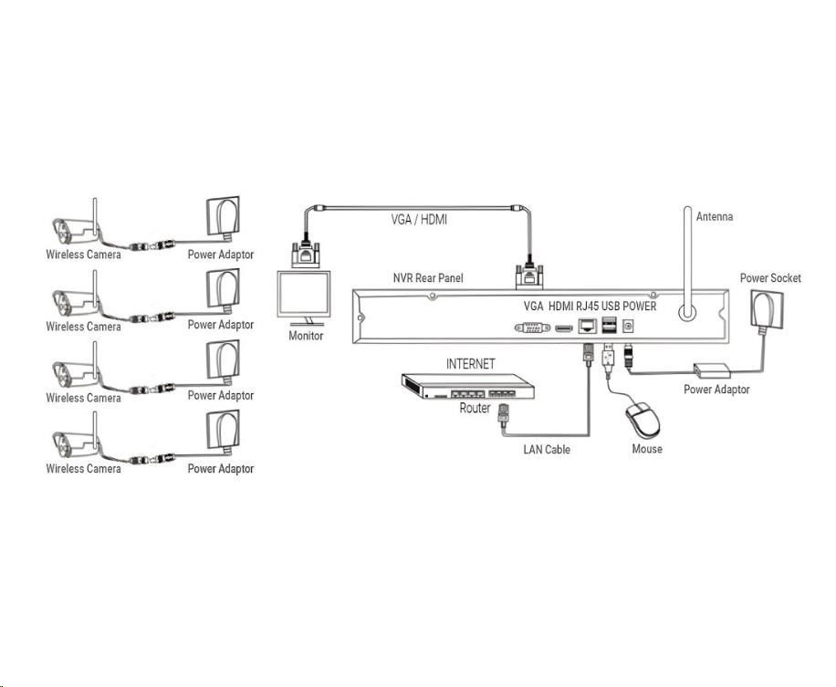 | Obsah balenia | NVR jednotka s 8 kanálmi, SATA pripojením pre až 8TB disk 4x Bezdrôtová Bullet IP66 kamera s nočným prísvitom 4x Anténa pre bezdrôtovú kameru 2,4G 5dB 1x napájací adaptér DC 12V 2A pre NVR 4x napájací adaptér pre kamery 4x sada pre upevnenie kamery 4x bajonetová tesniaca krytka pre RJ45 konektor 1x Anténa pre NVR jednotku 1x USB myš 1x SATA kábel pre pripojenie HDD 1x Používateľský manuál |