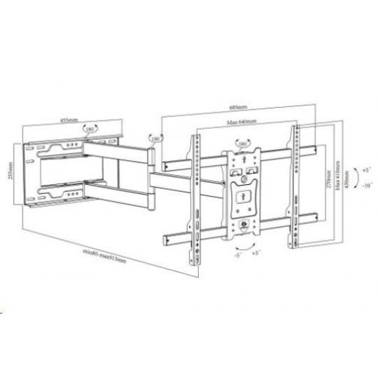 Dlhý otočný držiak na televíziu Ergosolid ONYX-20 Vynikajúci držiak s dĺžkou 80-915mm a možnosťou otočiť TV 70" kolmo na stenu na obe strany Kvalitný nástenný držiak na zavesenie televízorov s uhlopriečkou 43" až 75", televízory s uhlopriečkou do 70" je možné na držiaku otáčať kolmo na stenu na obe strany. Konštrukcia držiaku je oceľová a zabezpečí bezpečné a spoľahlivé zavésenie televízorov, ktoré majú hmotnosť až 45kg. Televíziu je možné nielen otáčať do strán, ale aj naklápať nahor alebo nadol a meniť vzdialenosť od steny. V prípade nepresnej inštalácie alebo nerovností držiak umožňuje korekciu až +/- 5°. Podporuje VESA štandardy 200x100 až 600x400. Farebné prevedenie čierne, záruka 3 roky. Extra dlhý držiak na TV na otáčanie TV až 70" kolmo na stenu - ergosolid onyx20 Technické údaje: nosnosť 45kg VESA štandardy 200x100 až 600x400 na televízie 43" až 75" otáčanie TV do strán +/- 90° TV s uhlopriečkou do 70" je možné otočiť aj kolmo na stenu na obe strany vzdialenosť TV od steny 80-915mm sklon +5° / -10° korekcia roviny +/- 5° kvalitná oceľová konštrukcia bezpečný a spoľahlivý držiak balenie obsahuje sadu inštalačného materiálu farba čierna záruka 3 roky