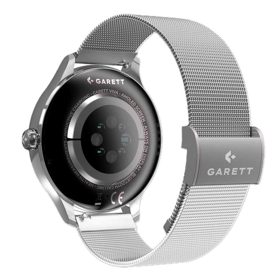 Smartwatch Garett Viva – to je technológia a nadčasová elegancia v jednom. Sú vybavené AMOLED displejom, ktorý zaručuje jasný a čitateľný obraz za všetkých podmienok. Ďalšou výhodou je v sade priložený pohodlný silikónový remienok, ktorý je možné podľa okolností meniť za kovový remienok – vďaka nim budú smart hodinky vyzerať dobre tak počas aktívneho dňa, ako aj na večernom stretnutí. Takisto v záujme zdravia ponúkajú viac než 100 rôznych športových režimov, ďalej monitor srdcového tepu, pulzný oxymeter, monitor krvného tlaku, monitorovanie spánku a ďalšie zdravotné merania. Spoľahlivá komunikácia cez Bluetooth a notifikácie z telefónu z nich navyše robia dokonalého spoločníka pre každodenný život.