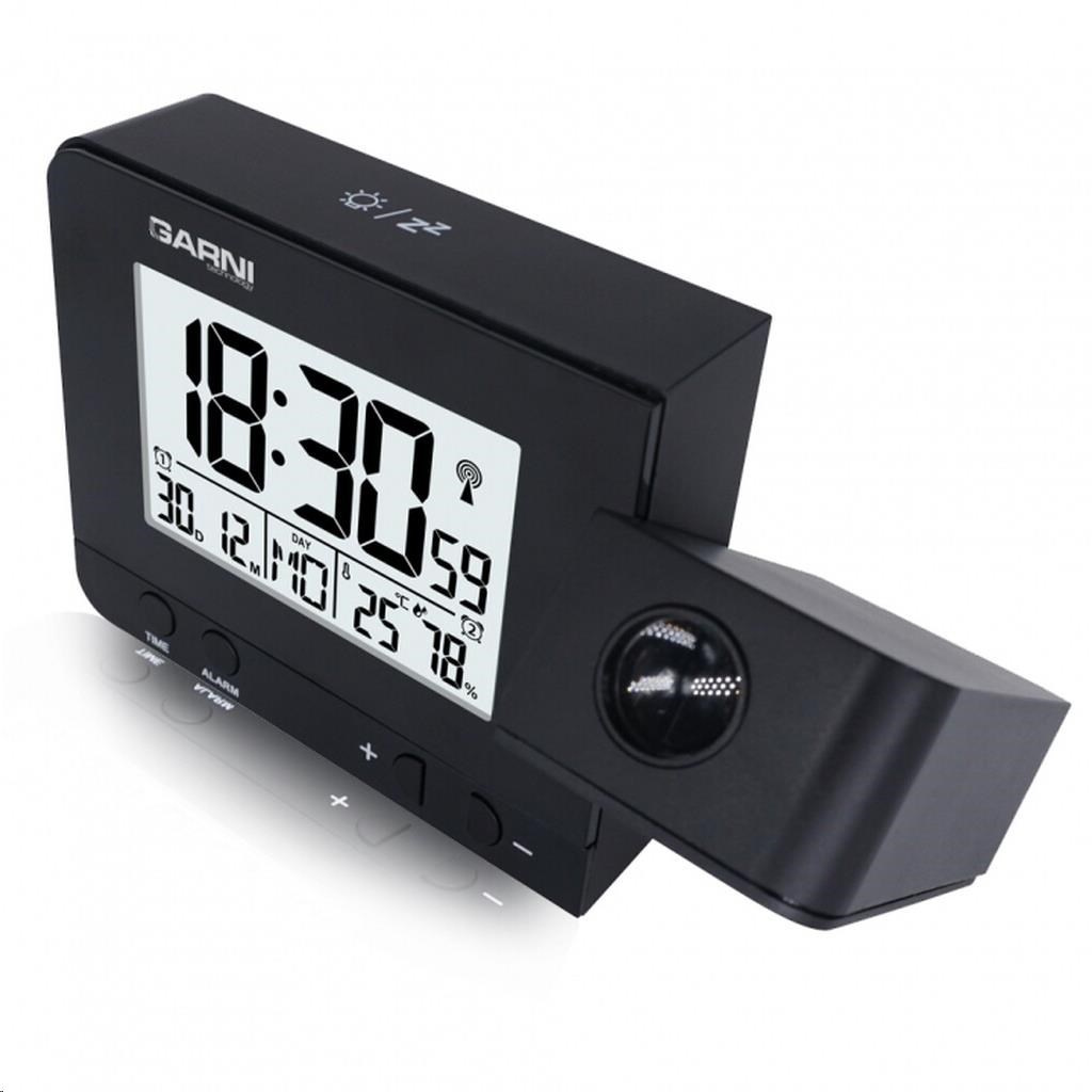 Digitální budík s projekcí času a vnitřní teploty s LCD displejem, časem řízeným rádiovým signálem DCF-77 a měřením vnitřní teploty a relativní vlhkosti