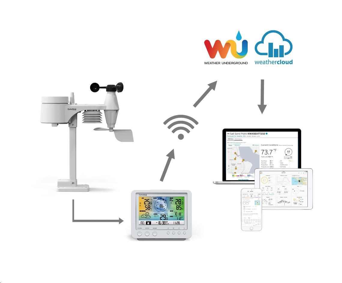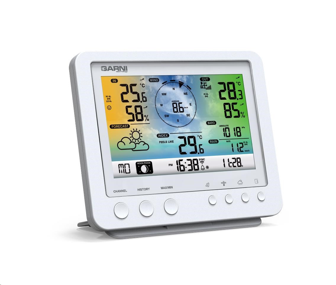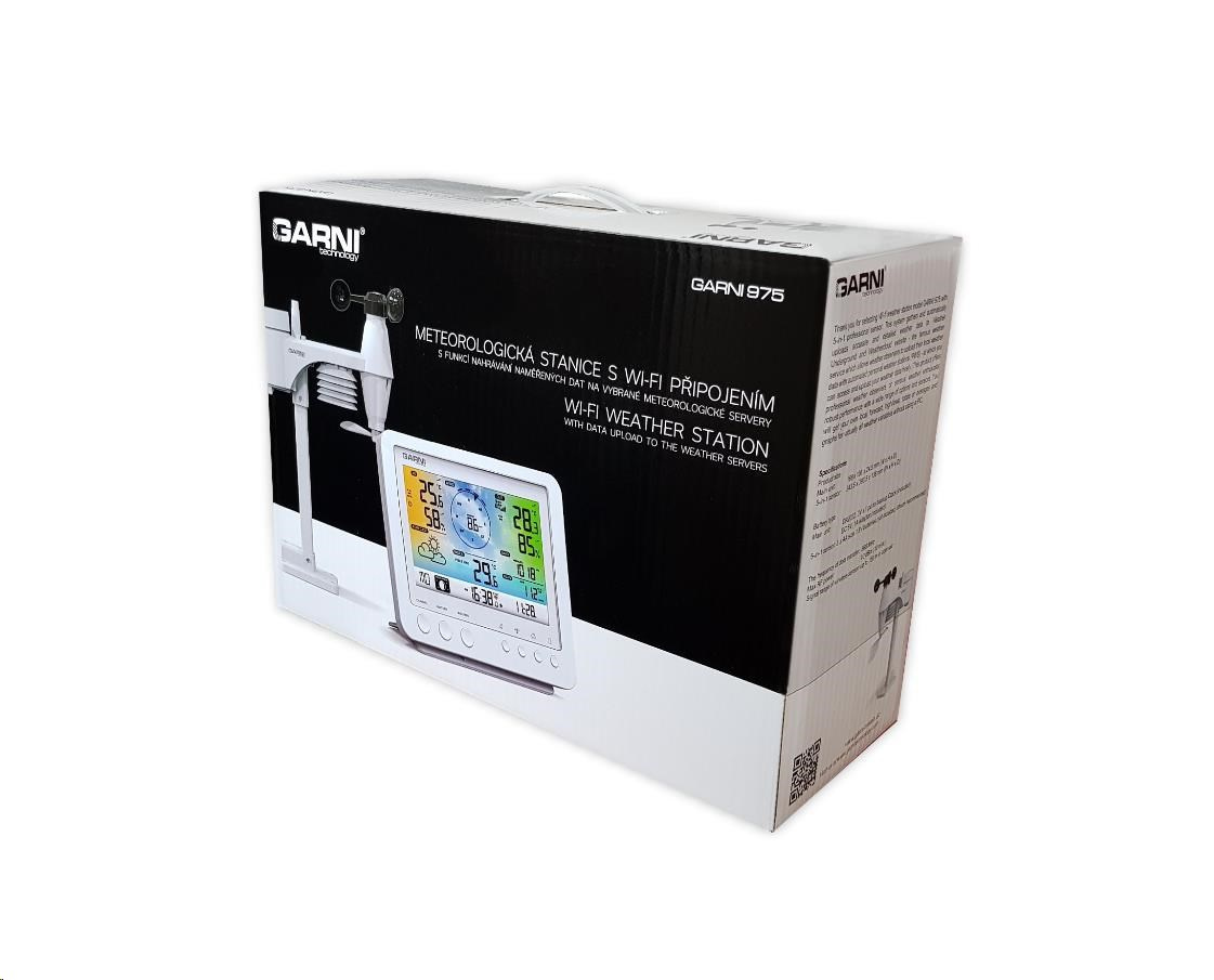 Wi-Fi meteorologická stanice s integrovaným bezdrátovým čidlem 5 v 1 model GARNI 975 je vybavena mnoha funkcemi zajišťujícími informace o předpovědi počasí. Integrované bezdrátové čidlo pracuje na frekvenci 868 MHz a měří teplotu, relativní vlhkost, rychlost a směr větru a dešťové srážky.