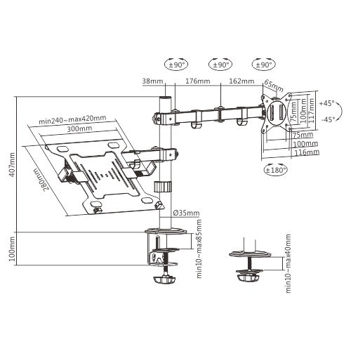 - Držiak na stôl s ramenom monitora a stojanom na notebook
