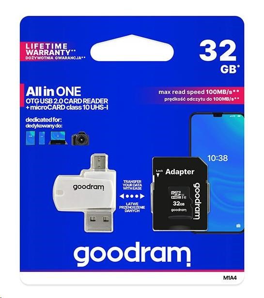 Karta GOODRAM microSDHC 32GB M1A4 All-in-one (R:100/W:10 MB/s), UHS-I Class 10, U1 + adaptér + čítačka kariet OTG