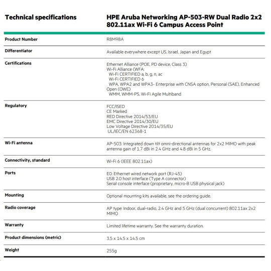 HPE Aruba Networking AP-503-RW Dual Radio 2x2:2 802.11ax Wi-Fi 6 Campus Access Point.