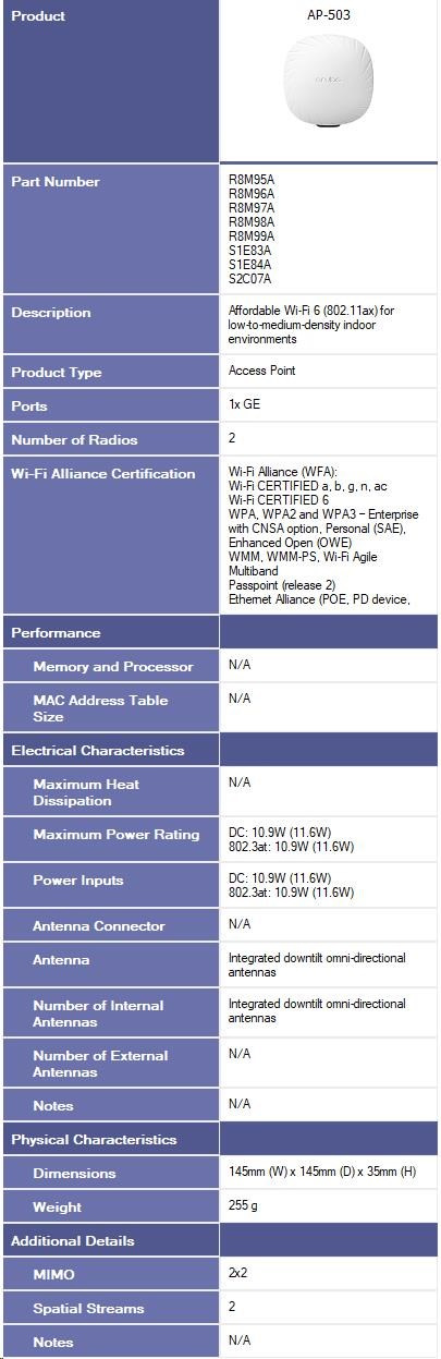HPE Aruba Networking AP-503-RW Dual Radio 2x2:2 802.11ax Wi-Fi 6 Campus Access Point (Includes Mount Bracket) R8M98A