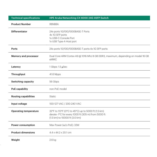 The HPE Aruba Networking CX 6000 Switch Series is a modern family of entry-level access switches ideal for branch offices, midsize businesses, and small enterprises. Optimized for reliable, simple, and secure access, the CX 6000 Switch series provides a convenient and cost-effective wired access solution for networks supporting IoT, mobile, and cloud applications.